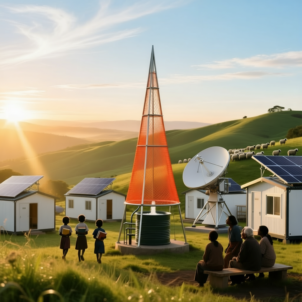 Atmospheric Water Access: Housing clusters are served by nearby Warka Water Towers, ensuring clean drinking water is available at the doorstep.